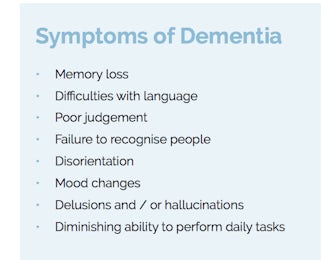 Dementia symptoms vary greatly from person to person and also depend on the dementia diagnosis. There are many different forms of dementia but the three main types include: Alzheimer’s Disease, Vascular Dementia and Dementia with Lewy Bodies.